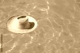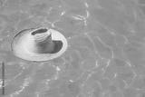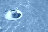 Straw hat on the surface of blue clear swimming pool with free space. Summer vacation concept.