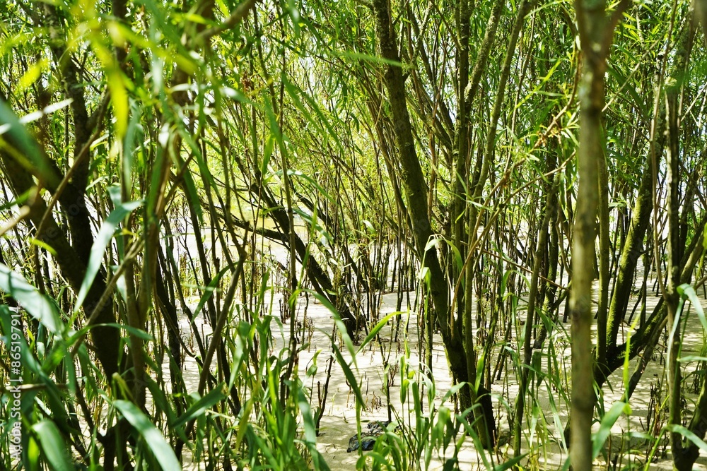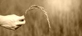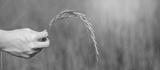 Male agronomist hand holding rice spike in green rice field. Cereal plant cultivation. Agriculture, nature and food concept