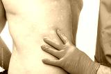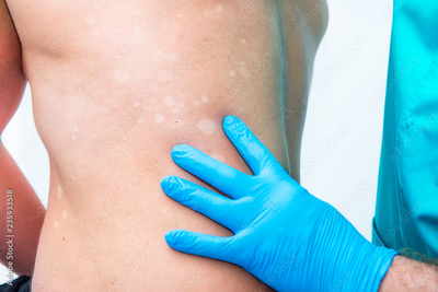 Close up doctor dermatologist hands in gloves examines skin depigmentation on mans back. Selective focus. copy space.