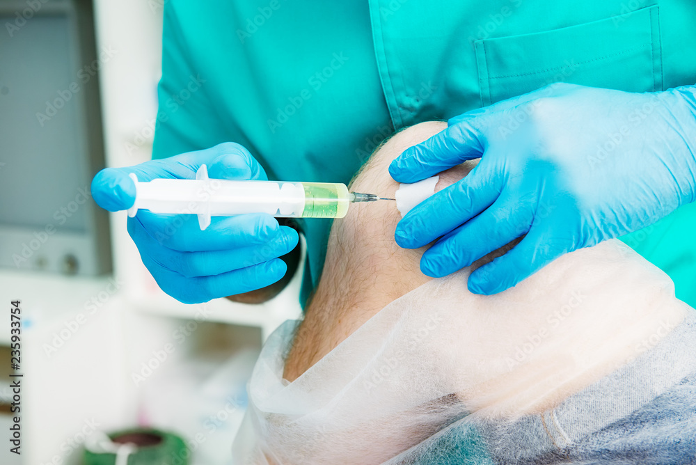 Close up Neurologist doctor makes an injection therapy (blockade) into knee muscle of male patient. Alternative pain treatment concept. Selective focus, space for text.