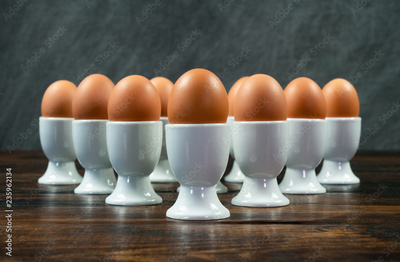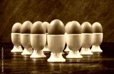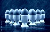 Ten Boiled Eggs in Egg Cups on a Table
