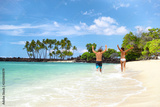 Happy couple beach fun on travel holiday hawaii vacation. People with open arms running in freedom of happiness on summer destination.
