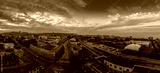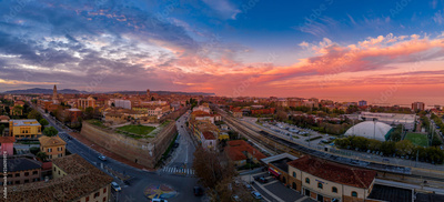 Aerial panorama of popular travel destination beach town Fano in Italy with sunset blue, red, purple sky near Rimini in the Marche region.