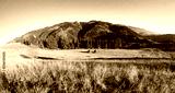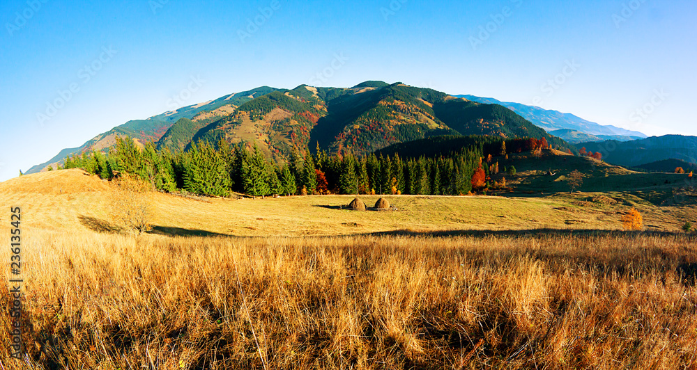 Autumn. Fall. Sunny autumn panorama with mountain, forest and blue sky in the forest of Carpathians - freedom and open space