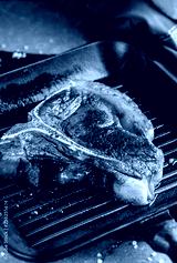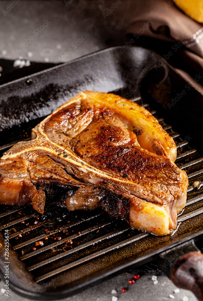American cuisine. The concept of pral cooking meat. A fried piece of T-bone steak lies in a grill pan with peccias, thyme, and garlic.