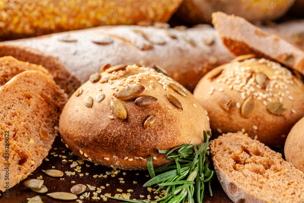 Homemade wholemeal tomato bread with basil and pumpkin seeds, baguette, buns, lie on a wooden table. Background image