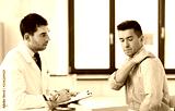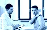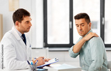 medicine, healthcare and people concept - male patient showing sore arm to doctor at medical office in hospital