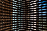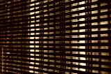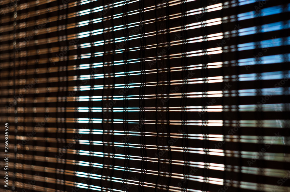 The interior of the home, sunlight shining through the bamboo blinds at the window.
