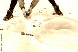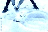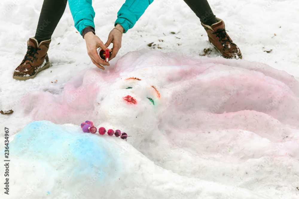 hands paint on the face of the girl sculpted from the snow