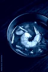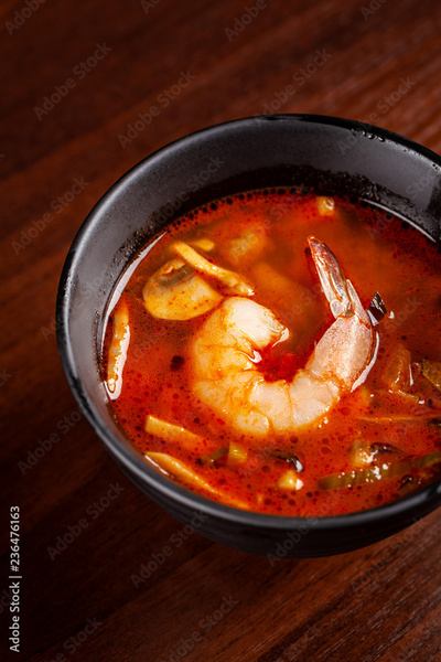 Concept of Asian cuisine. Soup with seafood, shrimps and vegetables.