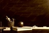 Teacher's desk with writing materials, a book and an apple, a blank for text or a background for a school theme. Copy space.