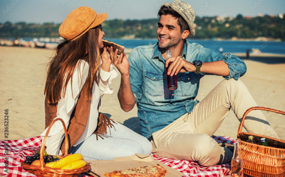 Beautiful young couple having fun on the beach. Lifestyle, love, dating, vacation concept