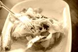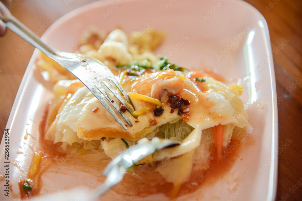 Close-up of Khao Pun Phak and iconic and local unique food of Laplae district in Uttaradit province of Thailand. (Steamed vegetables and minced meat wrapped in rice flour skin)