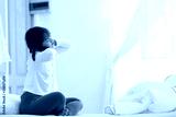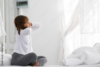 young Asian woman sitting on bed has neck pain after wake up in the morning,Healthcare Concept