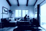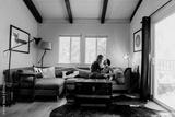 Young Attractive Caucasian Loving Valentines Couple Cuddling on Sectional Couch Furniture in Trendy Modern Minimalist Designed Living Room Black and White Interior