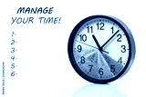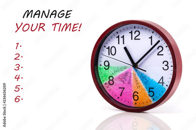 Time management concept: Round clock with a colored dial and action plan for a day on a white background.