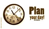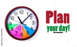 Time management concept: Round clock with a colored dial and action plan for a day on a white background.