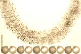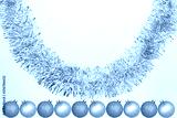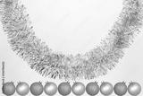 Hanging silver tinsel with silver and yellow Christmas baubles, isolated on a white background with copy space, christmas decorations.