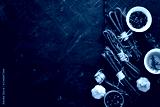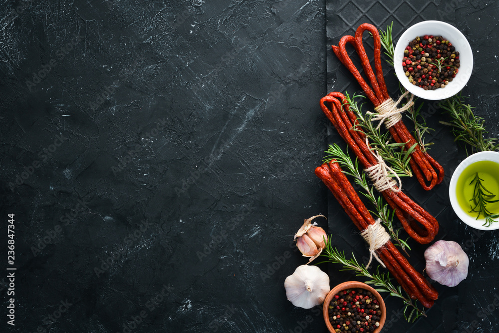 Sausages Kabanosi. On a black stone background. Top view. Free copy space.