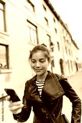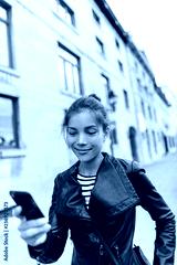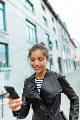 Phone young trendy chinese woman walking on city street using mobile smart phone texting message on messaging shopping app online on cellphone outside. Urban young people lifestyle . Technology.