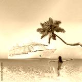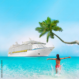 Cruise ship Caribbean tropical vacation travel girl in holiday beach destination with palm tree and bikini woman swimming enjoying ocean water. Background landscape with copy space on blue sky.