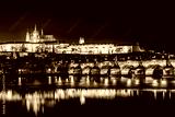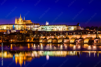 View of Charles Bridge, Prague Castle and Vltava river in Prague, Czech Republic during sunset time. World famous landmarks in Europe.