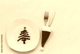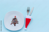 Festive dessert. Sweet Christmas tree made of chocolate with colored sprinkles on white plate and cutlery on blue background. Concept Christmas or New Year's treat at festive table Top view Copy space