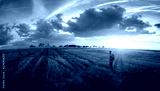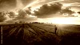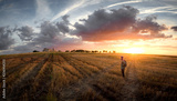very warm sunset in the plain of the pasture with abandoned house and trees in the background