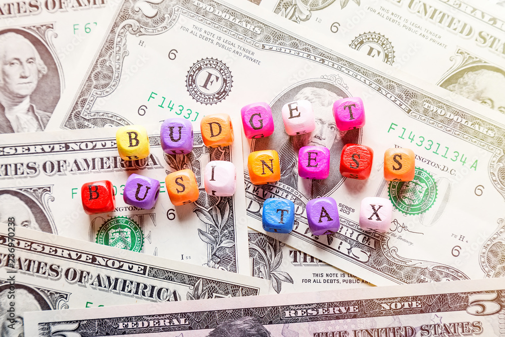 The words Budget, Business and Tax text on colorful wooden cubes on american dollar bank notes. Concepts of business management, financial plan or money saving.
