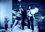 Young women stand on bed in festive room. They hold microphones and sing into them. Girls have fun.