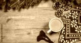 Winter and Christmas theme: Wooden background with cup of cocoa, pine tree cones and knitted wool hat.