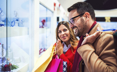 Shopping time. Young couple looking at jewels in jewelry shop. Consumerism, love, dating, lifestyle concept