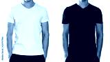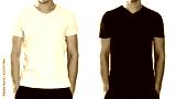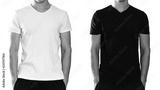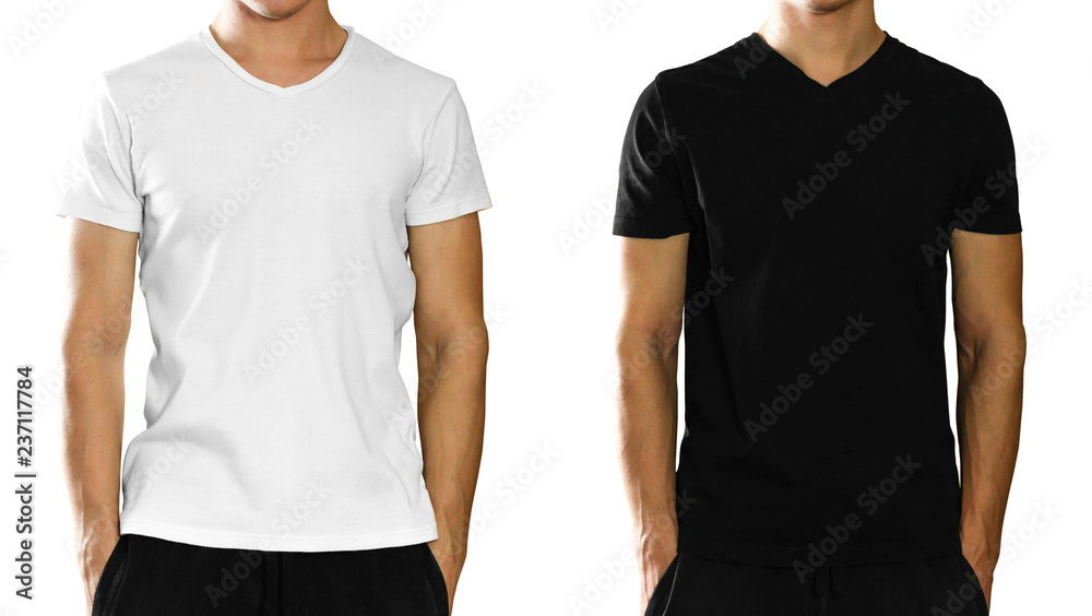 A man in an empty clean white and black t-shirt. Front view. Isolated on white background