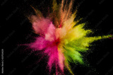 Colored powder explosion. Abstract closeup dust on backdrop. Colorful explode. Paint holi