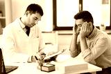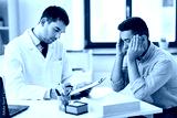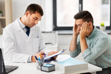 medicine, healthcare and people concept - doctor with clipboard and male patient suffering from headache at medical office in hospital