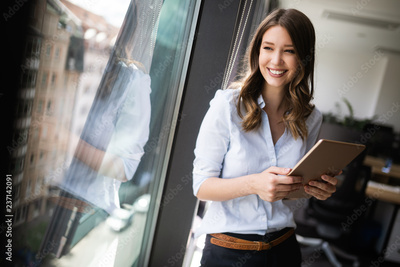 Attractive businesswoman using a digital tablet while standing in front of windows
