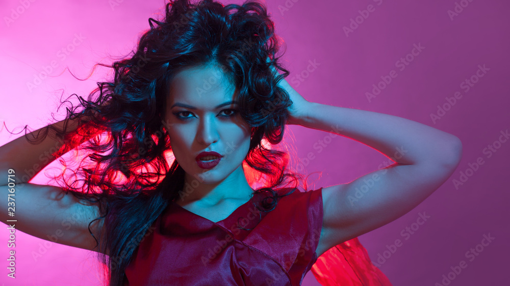 Femme fatale dancing, portrait in Studio with bright toning, blue and red color.