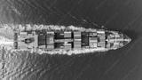 Aerial top view full speed container ship in the sea for logistics import export, shipping or transportation concept.