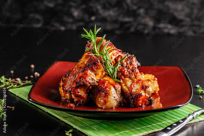concept of American cuisine. Glazed pork ribs barbecue with rosemary on a red plate. Beautiful serving in the restaurant. background image