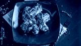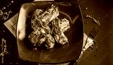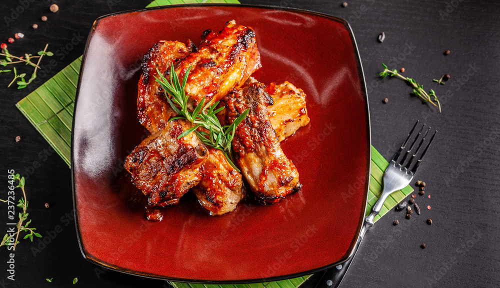 concept of American cuisine. Glazed pork ribs barbecue with rosemary on a red plate. Beautiful serving in the restaurant. background image