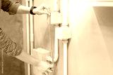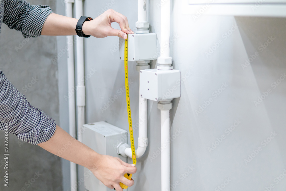 Male hand electrician using tape measure for measuring dimension of electrical conduit and electrical box on the wall. Electrical fitting installation and building construction concepts