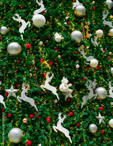 Close up Christmas tree decoration with red, gold, silver, and white balls, silver star and white reindeer. Xmas background. Christmas and Happy New Year background. Colorful ball on Christmas tree.
