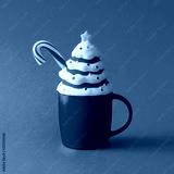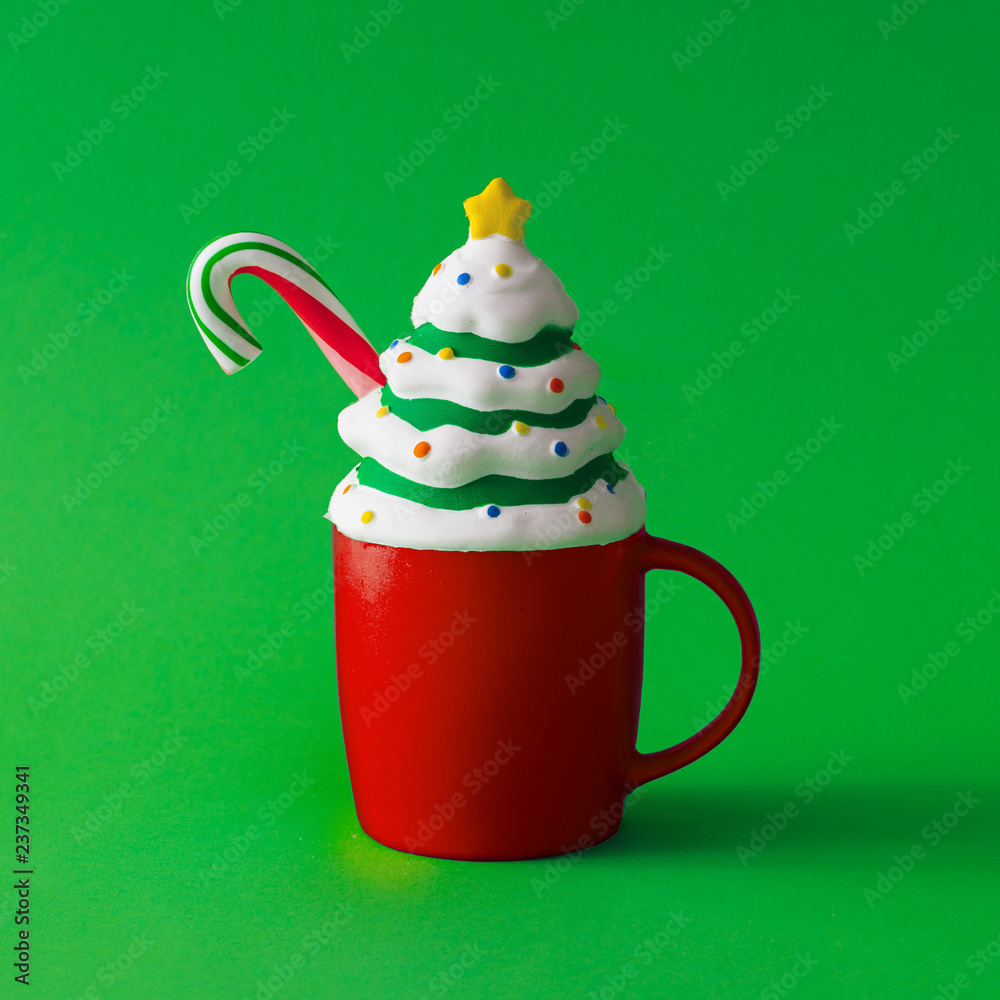 Cup of coffee with christmas tree decoration with candy. Hot winter drink. Minimal food concept.