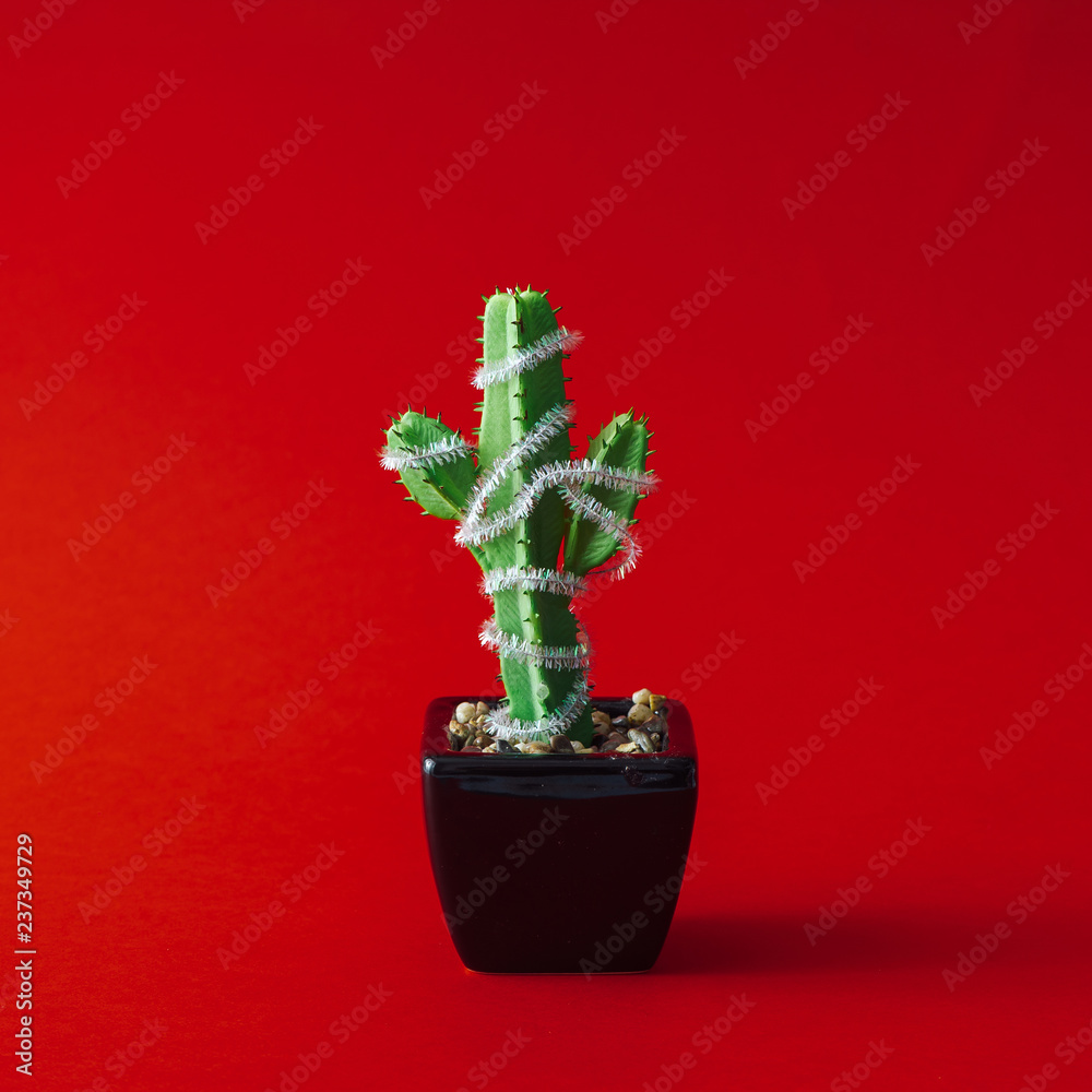 Cactus with Christmas tree decoration. Minimal New Year concept.