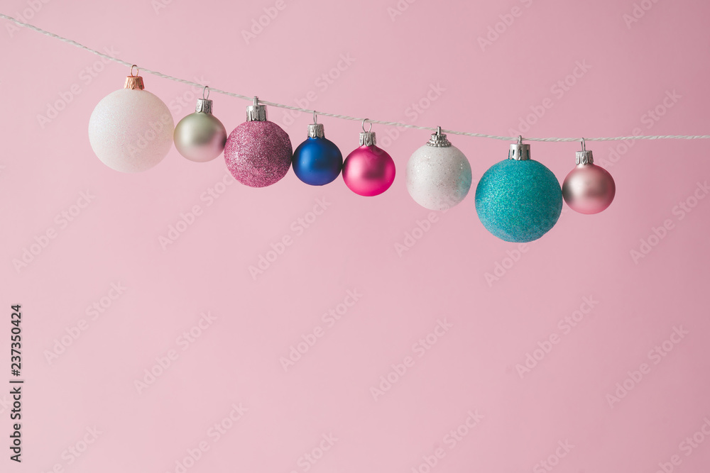 Colorful pastel Chrstmas decoration balls on pink background. Minimal New year concept with creative copy space.