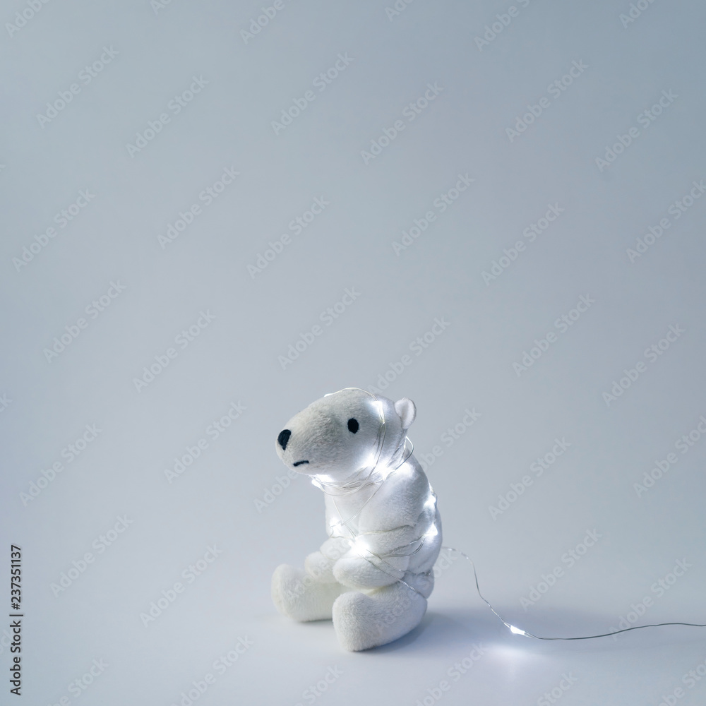Polar bear toy with Christmas tree lights. Creative holidays concept. Minimal New year decoration idea.