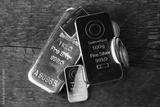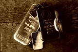 Silver bullion. Cast and minted bars and coins on a wooden texture background..