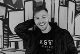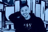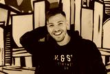 Portrait of Attractive Handsome Young Adult Man in Bomber Leather Jacket with Sunglasses Outside in Chilly Season Downtown Urban Street Art District Sitting in Front of Vibrant Colorful Graffiti Art W