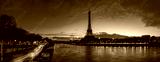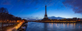 Eiffel Tower and Seine River banks in early morning light. Panoramic view in Paris, France