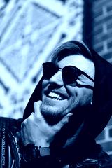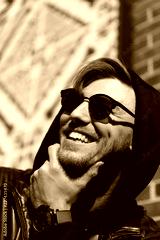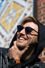 Portrait Headshots of a Young Handsome Attractive Modern Fashion Caucasian Male Guy Modeling near Local Outdoor Art in Urban City in Autumn Winter Season on Bright Sunny Day